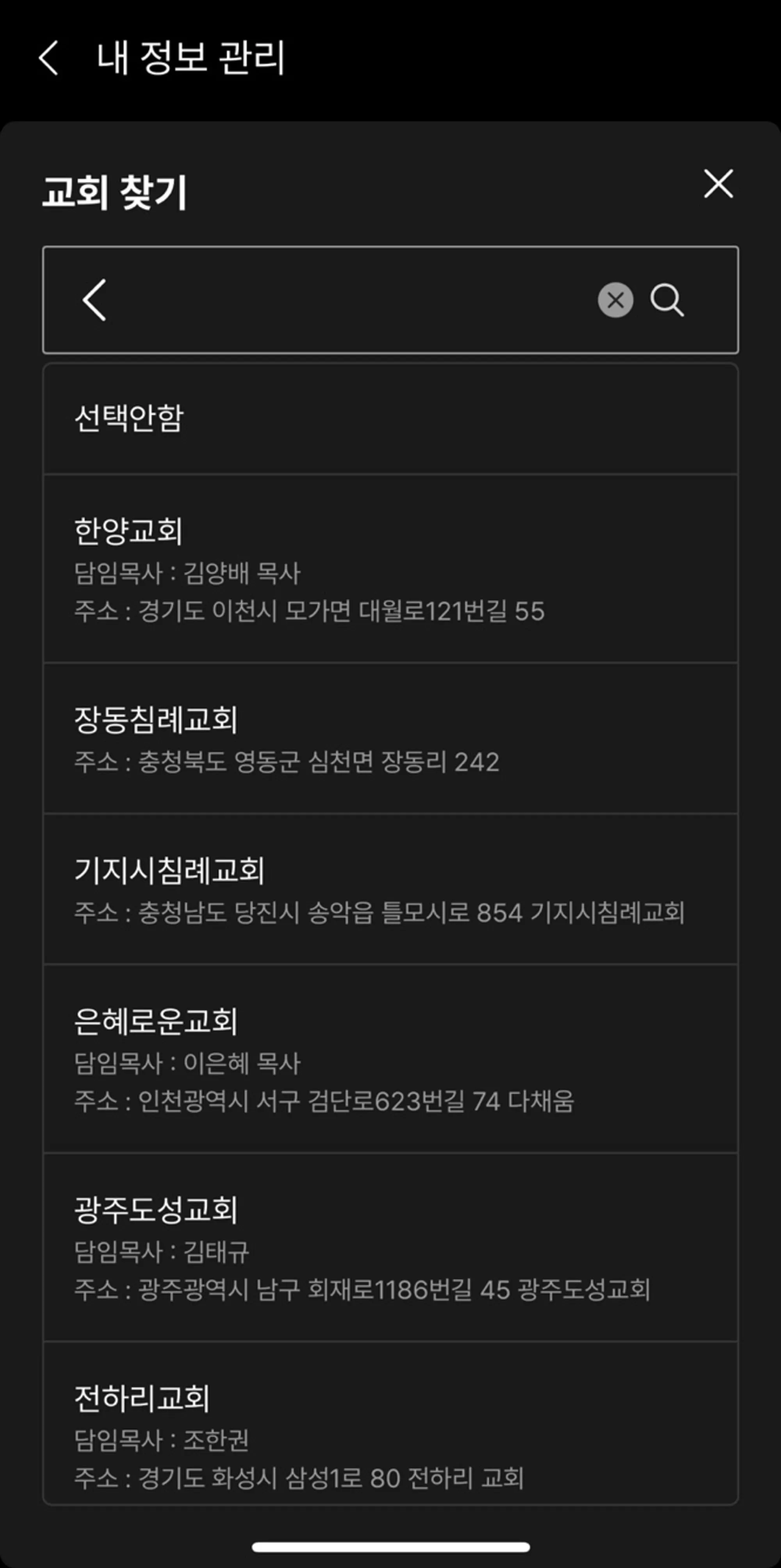 ‘나의 교회(단체)’는 한 번만 등록하면 이후 이용 시 홈 화면 상단의 교회(단체) 이름을 눌러 바로 ‘나의 교회(단체)’ 페이지로 이동할 수 있습니다.